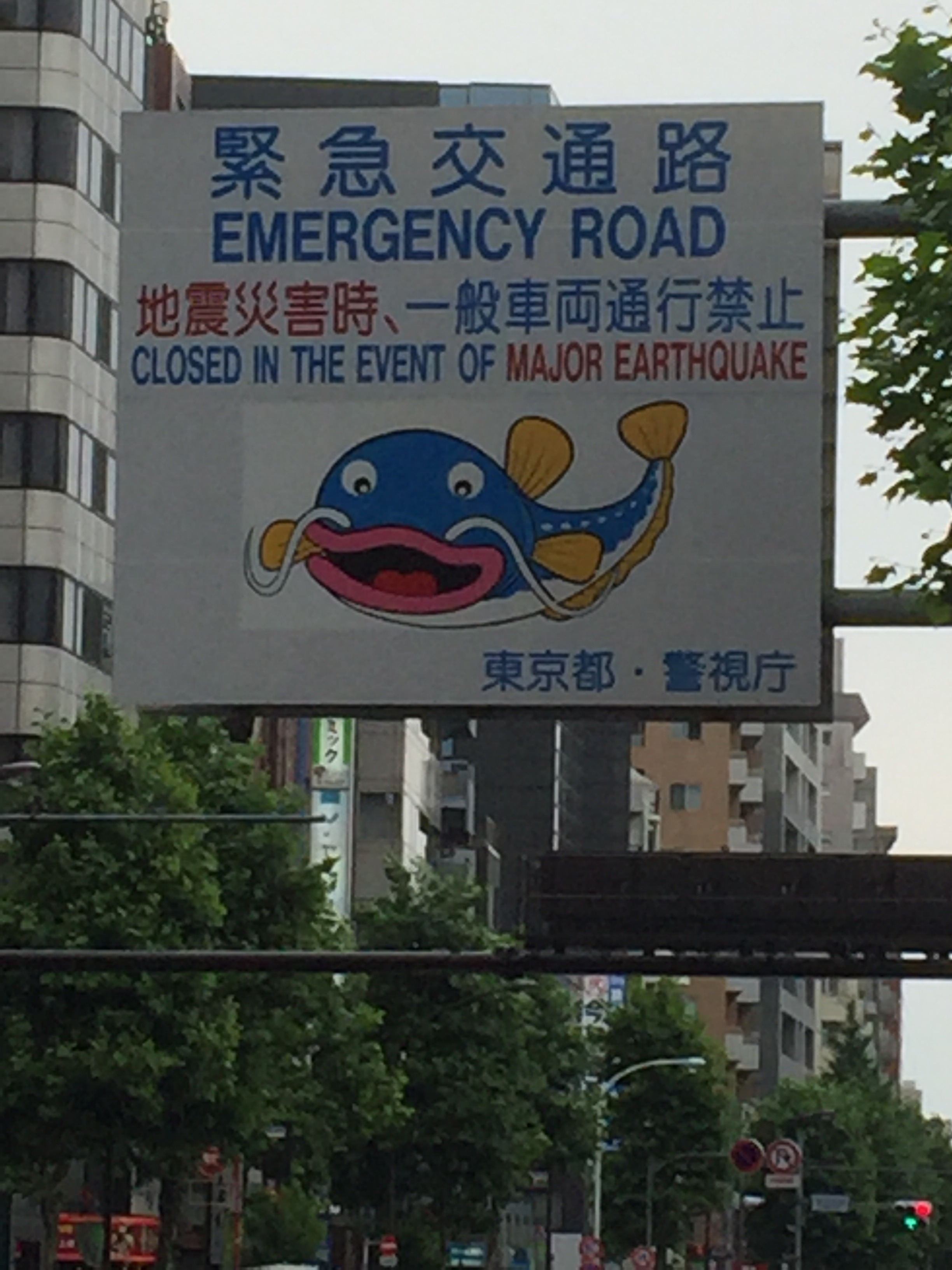 As I would walk to my guest house in Shinjuku each day, I would study this sign carefully. It took my a day or two to realize it was a catfish, not a whale. I thought a whale would be a better message carrier in a tsunami, but was told by friends that catfish can supposedly react to earthquakes before they happen. So this fellow is a much better guide in that particular emergency.