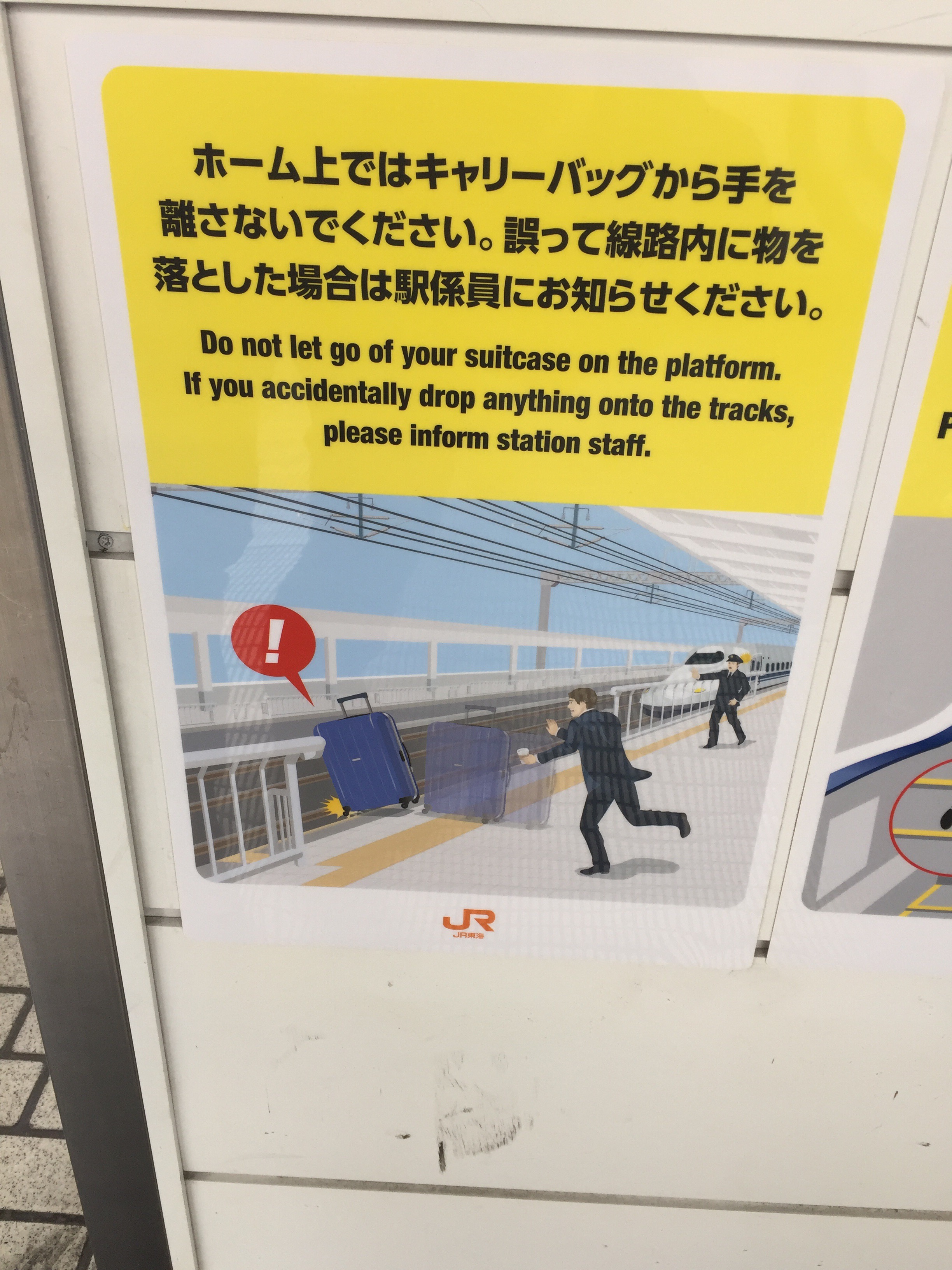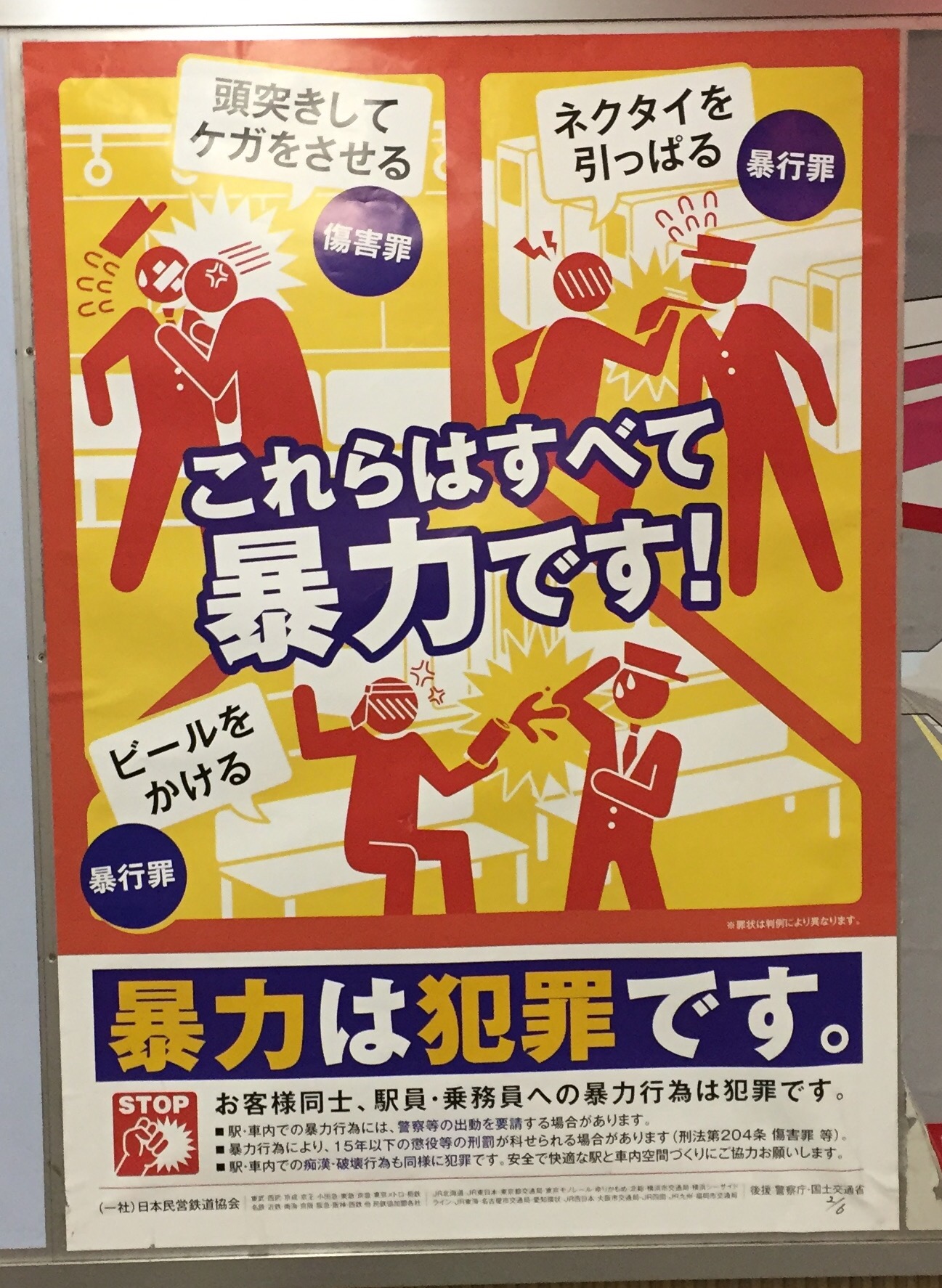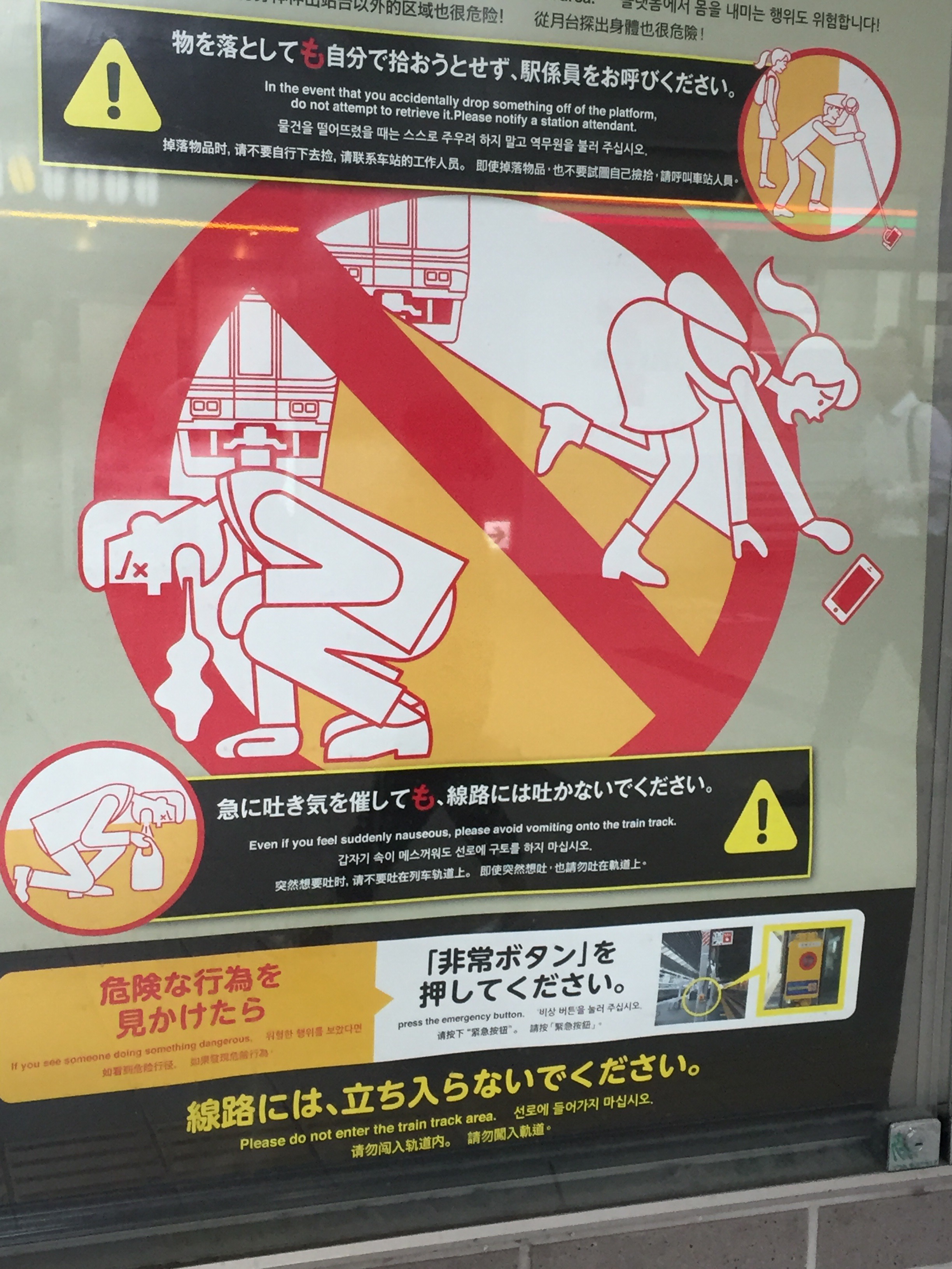 It’s the live humans you have to worry most about. Although the excesses of the salarymen era in the 80s when you had to carefully step around “salarymen pancakes” after 10pm are finished, it is still easy to witness this in the cities. What I learned from this poster is that the bad salaryman pukes on the tracks, while the good salaryman pukes in a plastic bag. The cultural nuances are always important.