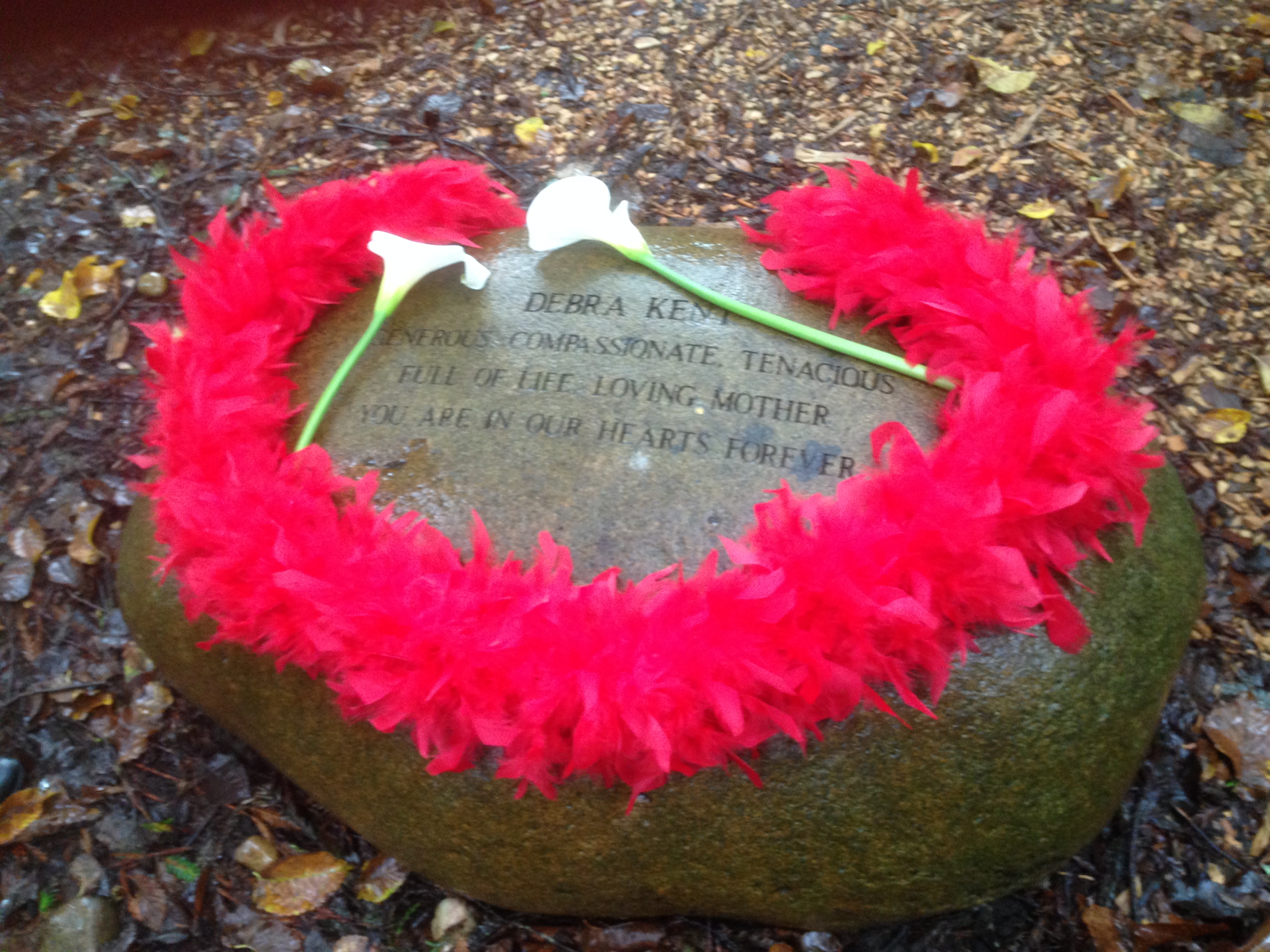 Many a gathering around the boulder in the Grove, emblazed with her name and the words “Generous, Compassionate Tenacious, Full of Life Mother, You are in our hearts forever” were marked by tears and laughter in the late afternoon, as the sun set and the damp coolness of the Grove descended around us. For a few moments, she was with us in our memories, in our stories, amazed that we were still there, amazed that we continue to honor her. The leaves on the trees, yellow and brown would fall silently as our witnesses to the cycle of life and death, of love and loss, of dark and light. What started in the last rays of the day, ended in the darkness of the evening, which shrouded the trees and rocks and path that were so clear when we arrived. A chill would settle in, and despite our down coats and hats, our noses would get cold and we would all begin to rock back and forth to keep ourselves warm. Our time with our memories would pass, yet the surroundings held us. Even in the dark, our hearts beat stronger, warmed by the love of life within the existence of suffering and death..